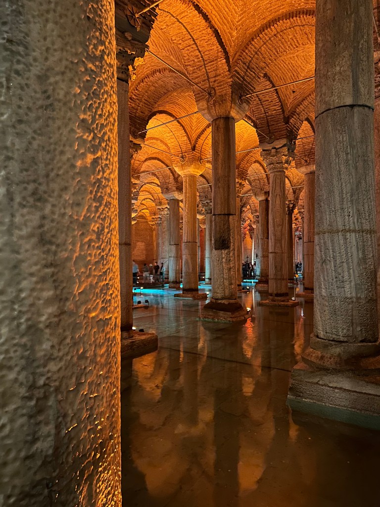 - Basilica Cistern: One of my favorite places we explored located right next to Hagia Sophia. It is an underground cistern built during the Byzantium Empire by Emperor Justinian for use as a water source for royalty. Like the Hogia Sophia you can get a guide to help you skip the line and give you a tour of the building. (We scheduled a tour online through an online American company but could not find the guide so we just found a guide that was in front of the building). If you do not get a guide it cost about $17 dollars or 300 lira.