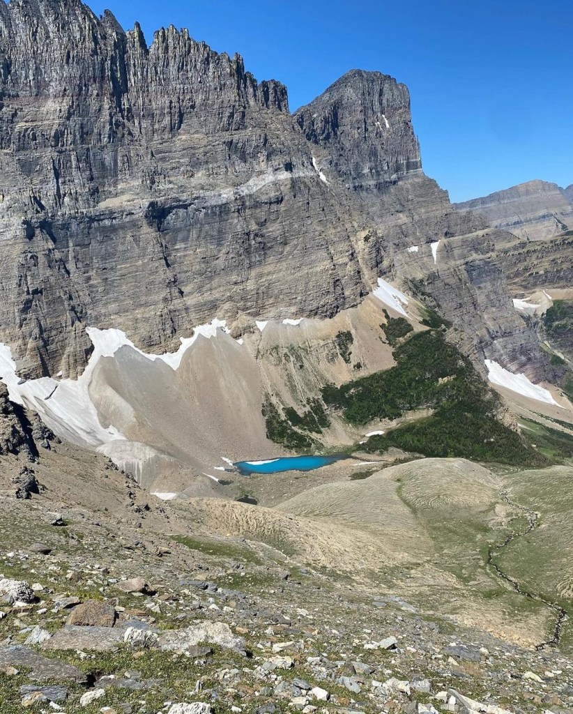- Piegan Pass Trail: This trail is amazing you will just be in awe the full trek. I normally recommend the all trail app for any hike but all trails did lie about the length on of this hike. It said 12.7 miles but we made it to mile 6 and we weren’t even close to halfway there. This trail is one of the more difficult trails I have done. It was pretty steep at parts and a lot of the trail you were hiking on the side of a steep mountain, and some areas still had snow. Before entering the trail there is warning signs about entering bear country. So be prepared with bear spray and a bear bell.